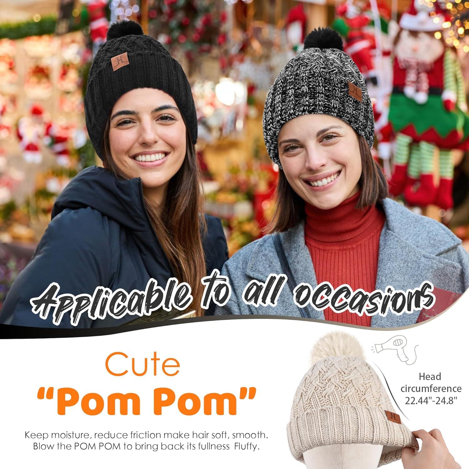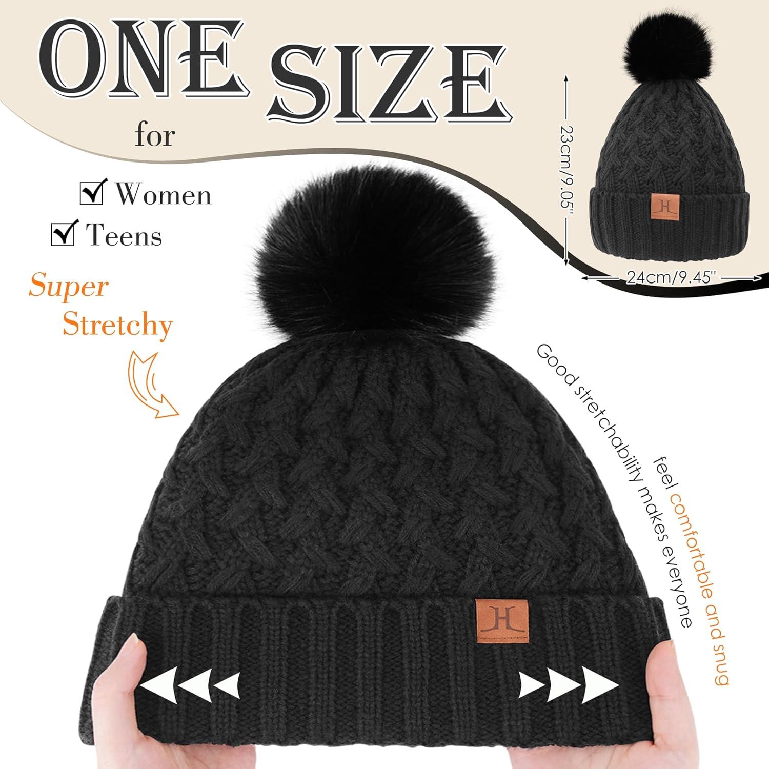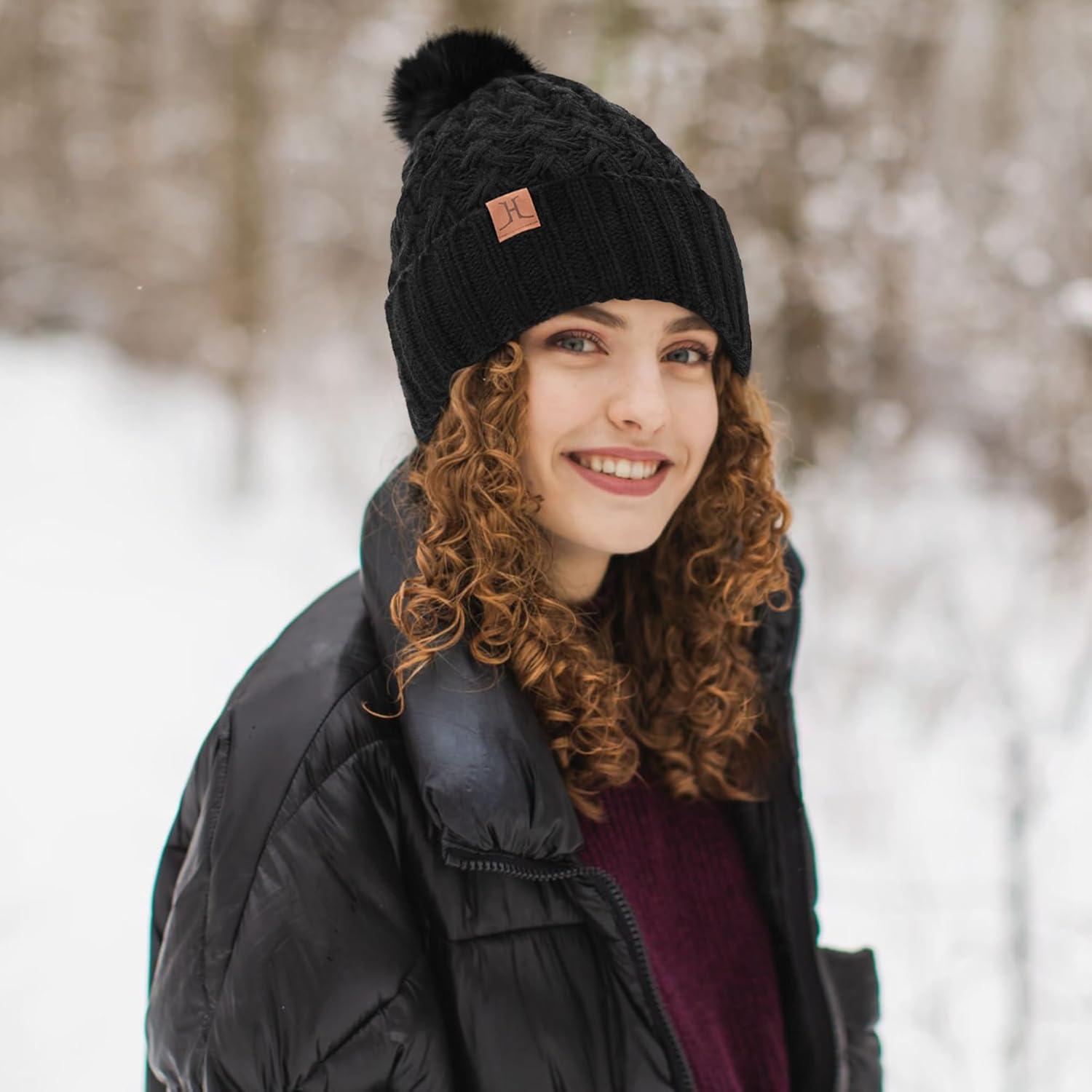 FZ FANTASTIC ZONE Winter Beanie Hats for Women with Fleece Lined Knitted Warm Womens Pom Pom Hat Chunky Cable Skull Cap Gifts(Black)