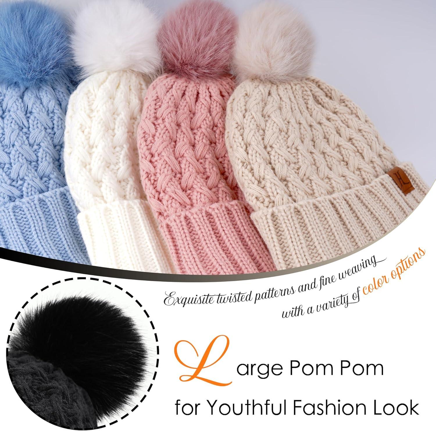 FZ FANTASTIC ZONE Womens Pom Pom Winter Hat Warm Cable Knit Beanie Hats for Women Skull Cap with Thick Fleece Lined Gifts(Pink)