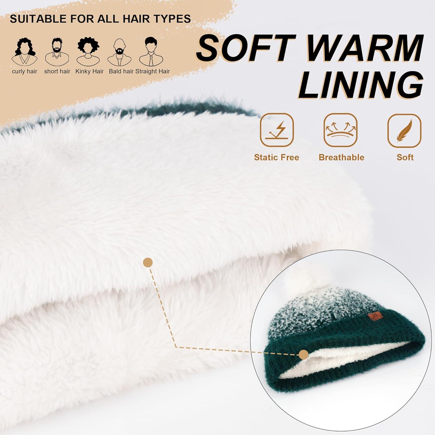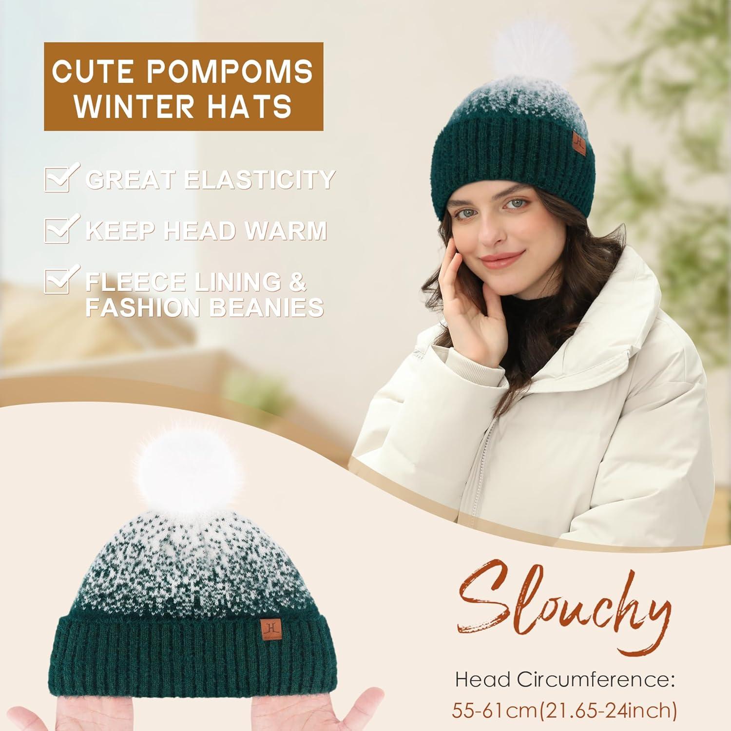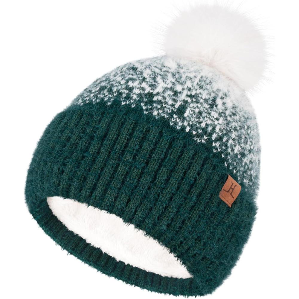 FZ FANTASTIC ZONE Womens Winter Hats Warm Knit Fleece Lined Cap Pompom Beanie Hats for Women Cold Weather(Dark Green White)