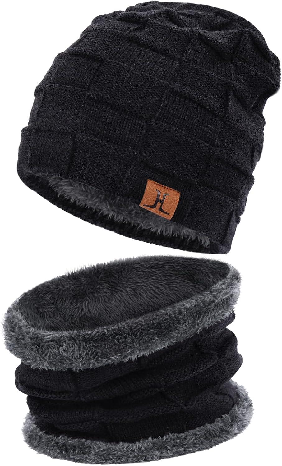 Mens Winter Beanie Hats Scarf Set Warm Knit Skull Cap Neck Warmer with Fleece Lined Winter Hat for Women(Pure Black)